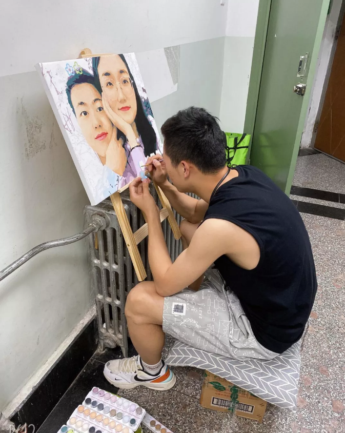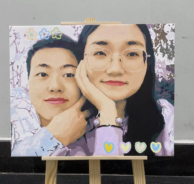 在她离开兰州的时候,我希望我能一直陪伴着她,为她拿起了第一次的画笔,画了我和她的合照油画